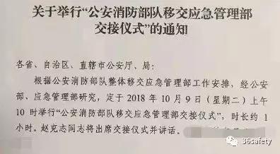 據(jù)多家媒體披露,根據(jù)公安消防部隊(duì)整體移交應(yīng)急管理部工作安排,經(jīng)應(yīng)急管理部、公安部部門研究,定于2018年10月9日(周二)上午10時(shí)舉行“公安消防部隊(duì)移交應(yīng)急管理部交接儀式”,時(shí)長約1小時(shí),公安部部長趙克志將出席交接儀式并講話,主會(huì)場(chǎng)設(shè)在公安部機(jī)關(guān)樓。