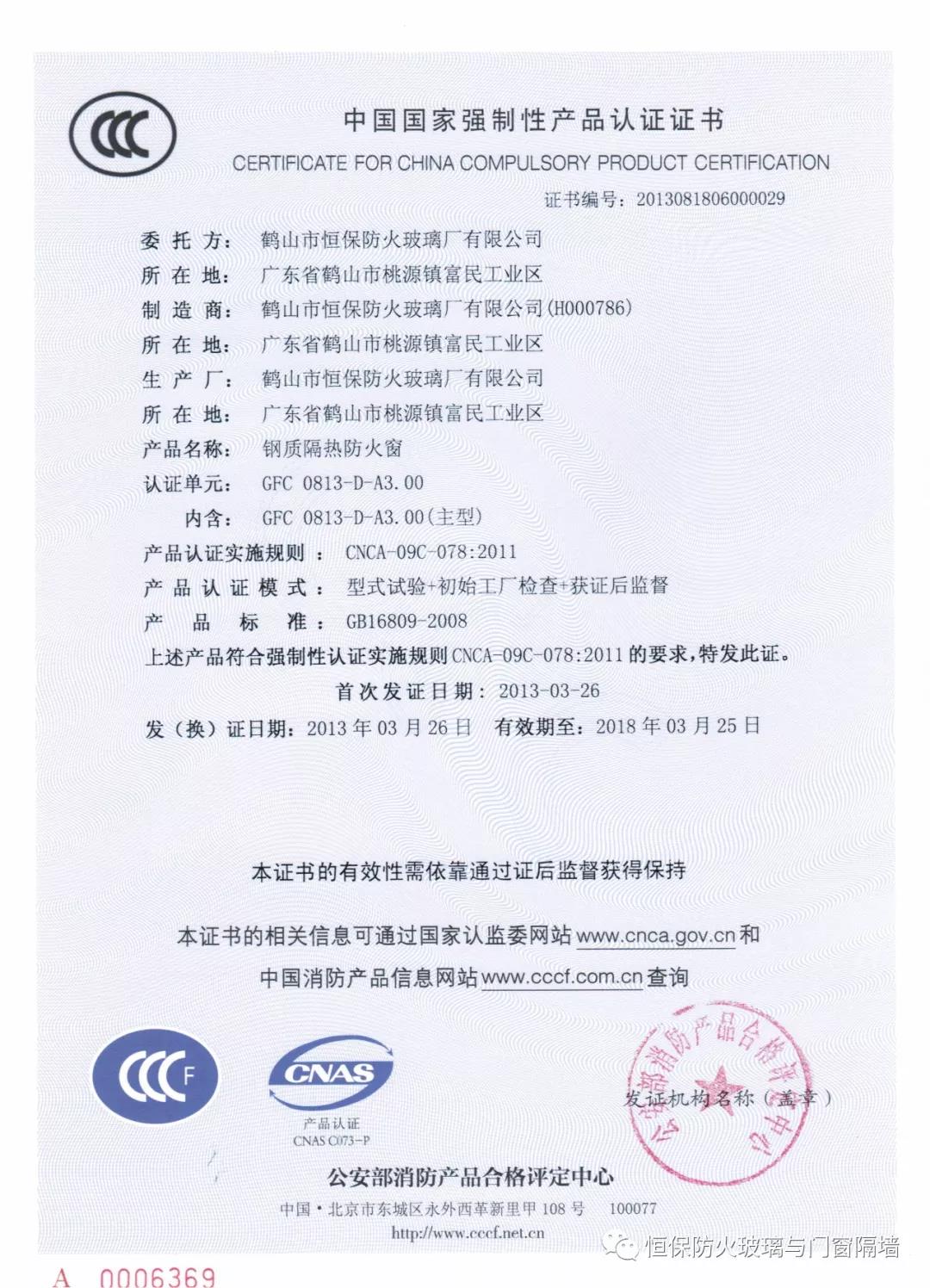 4.恒保公司一共12個產(chǎn)品獲得國家3C認證證書,2小時和3小時鋼質(zhì)隔熱防火窗更是國家首個通過國家認證的產(chǎn)品;